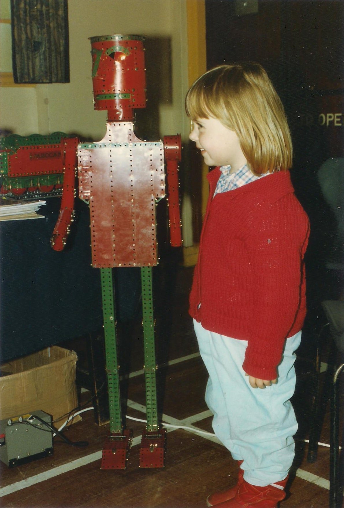 My daughter, Emma (aged 4), stands up to a walking robot built by visitor Roger Marriott at the 1990 exhibition