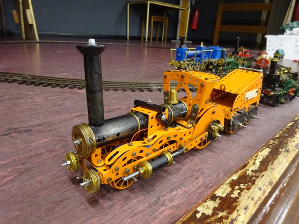 A gauge 1 live steam locomotive using a baby Mamod steam engine.