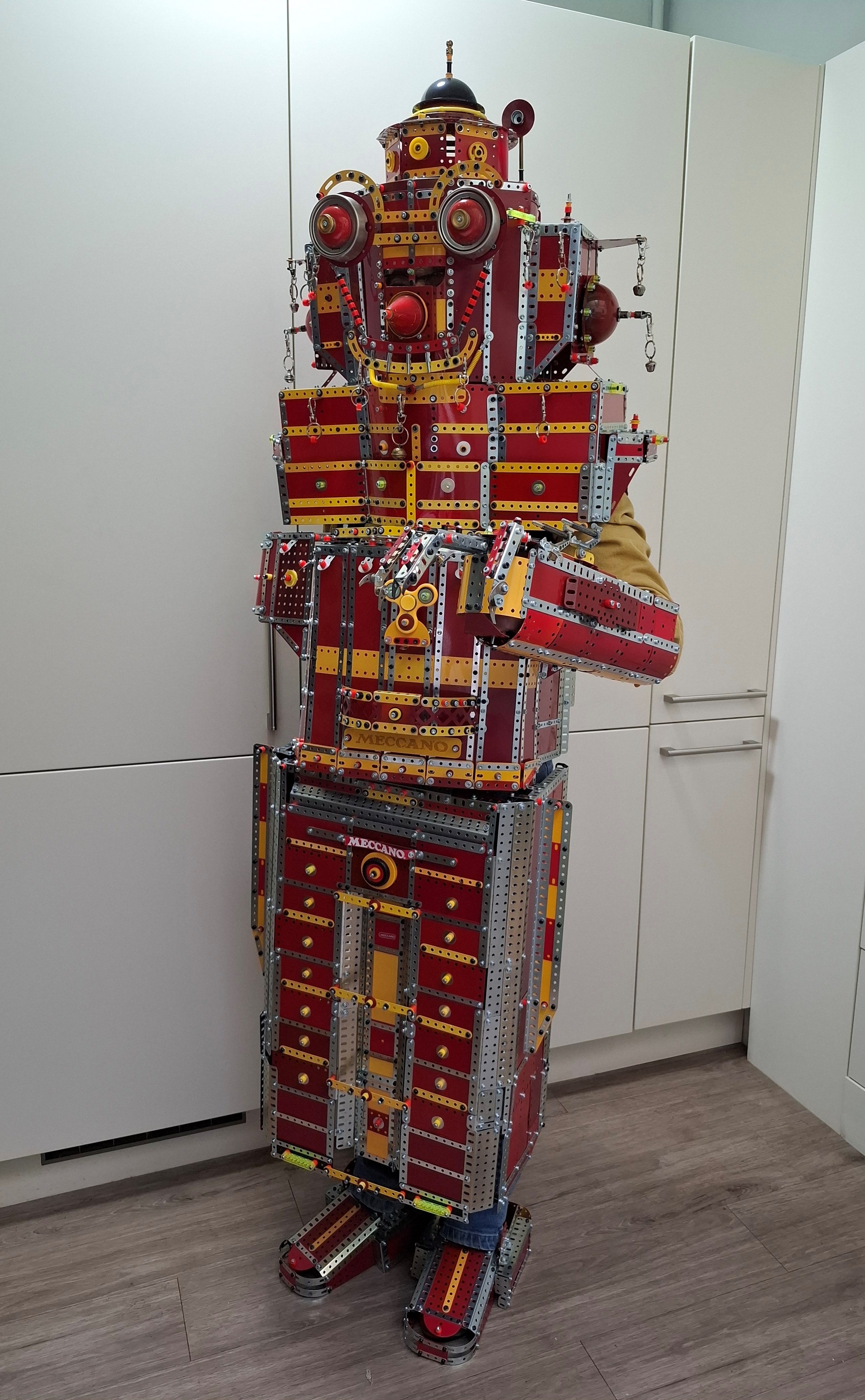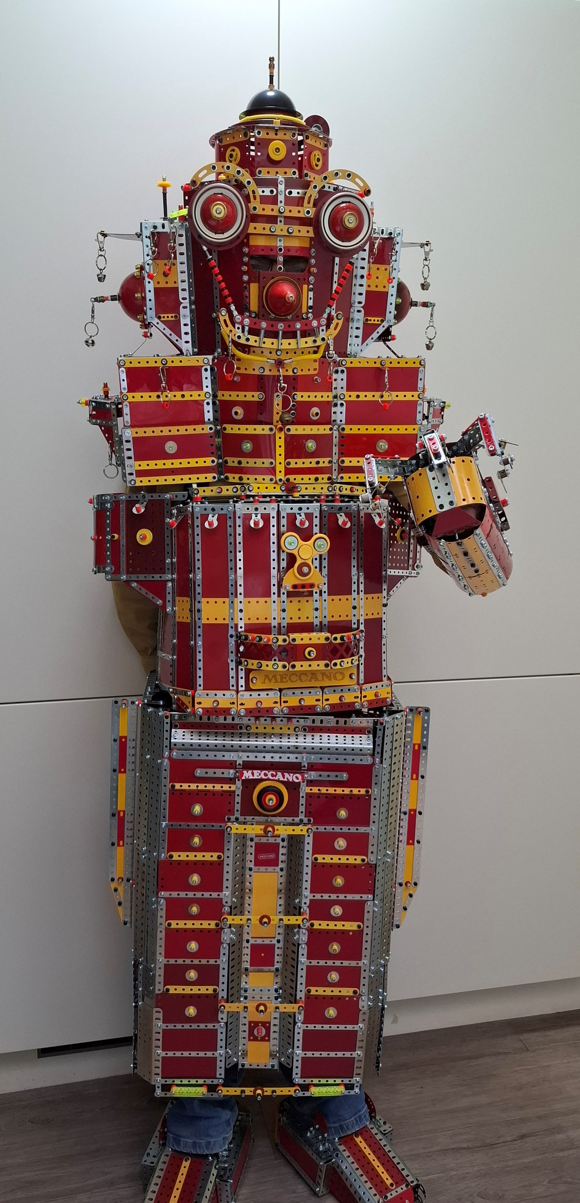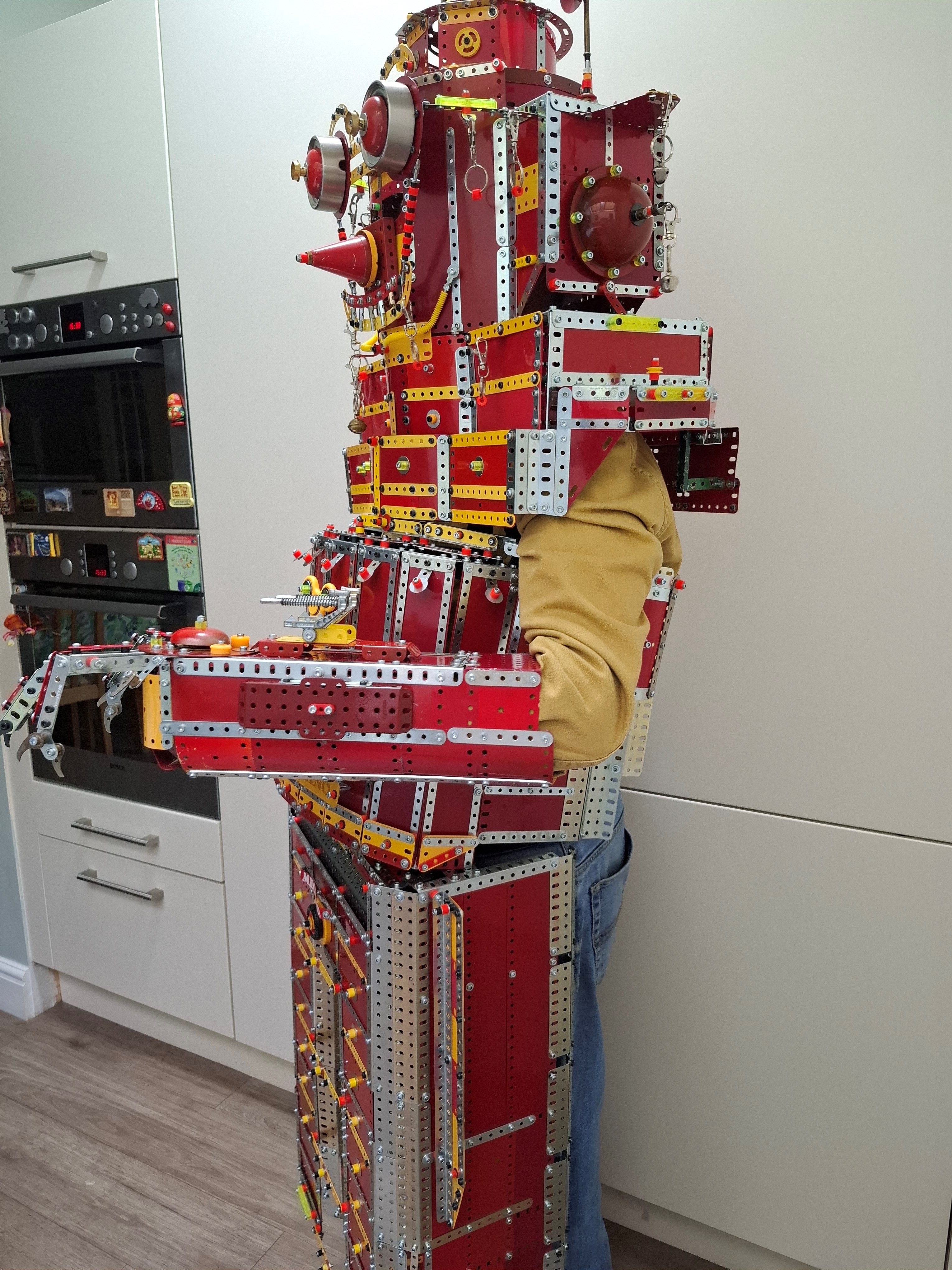 Actually, the reception I have enjoyed to the many nuts and bolted parts of my long-conceived Meccano-themed costume had been, up until that point, almost a little overwhelming, but I still personally wanted to improve the suit of armour further and so recently dismantled the original Metal Mickey version of it and started building the upgrade.