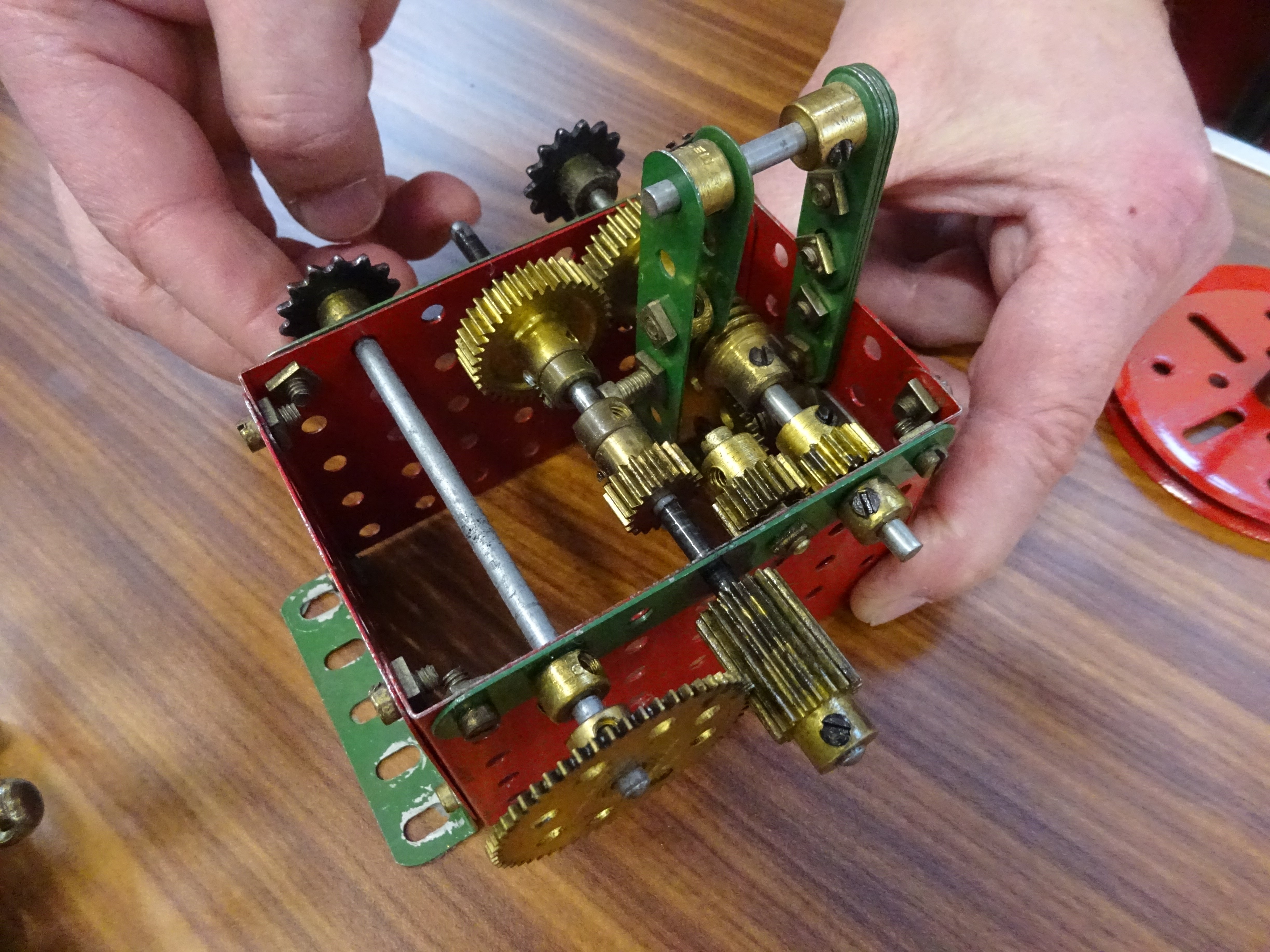A reversing gearbox in red/green parts, used to automatically drive an elevated railway end-to-end. Designed by Roger Marriot.