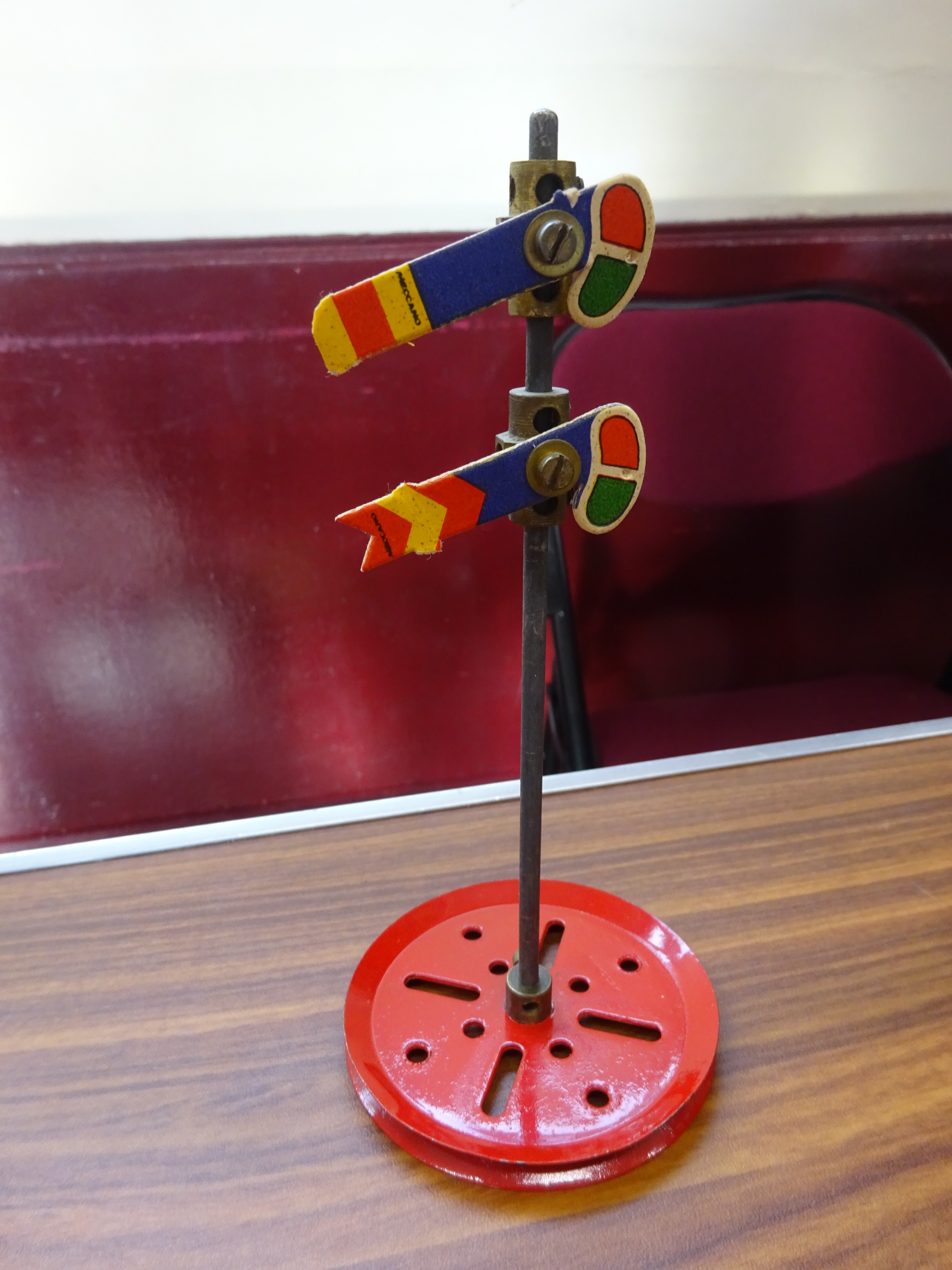 Railway signals (distant & home) made from cardboard postcard, attached to display pole using two octagonal couplings.