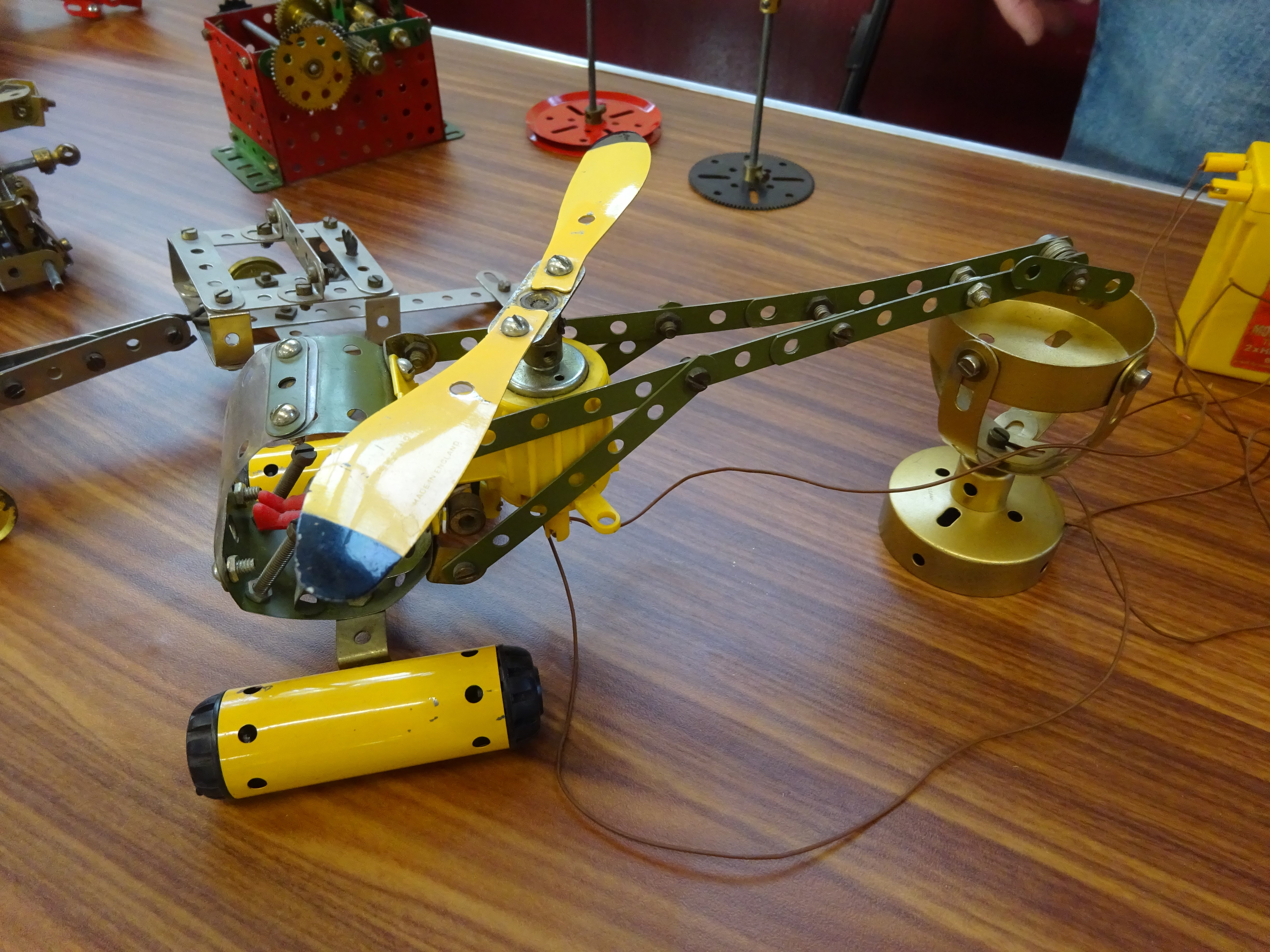 Helicopter in yellow/army green parts, motorised with crane motor.