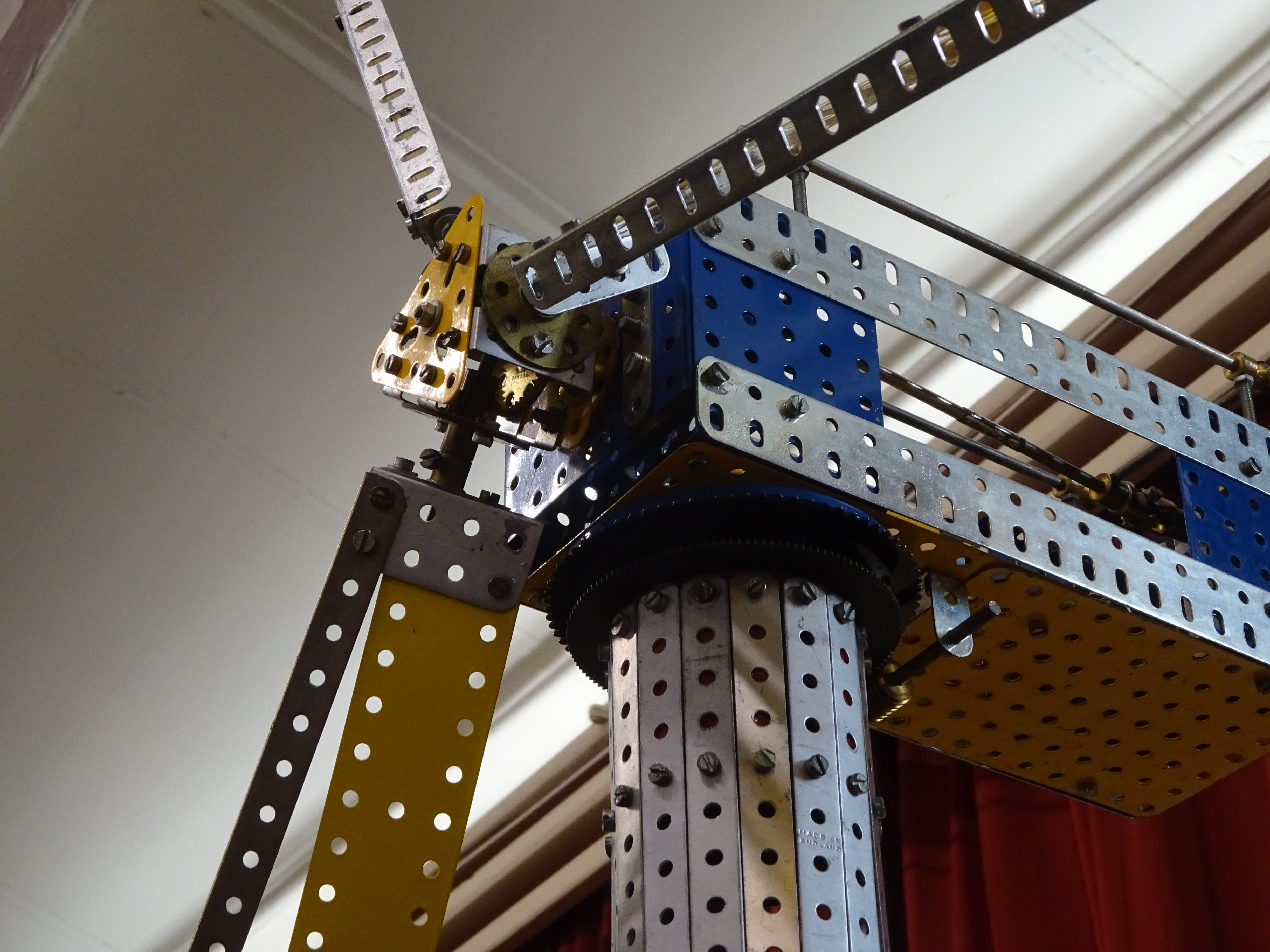 The motion of the blades is powered by a Meccano motor. The blades are linked by pinions meshing with a central contrate gear wheel, so the pitch of the blades can be adjusted. The nacelle (machinery housing) at the top of the tower rotates on a ball thrust bearing.