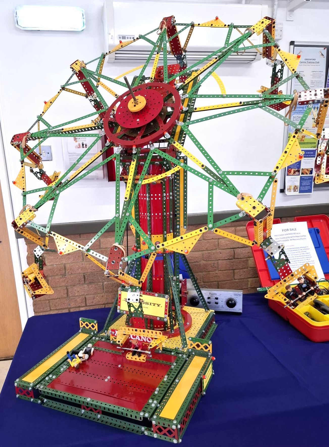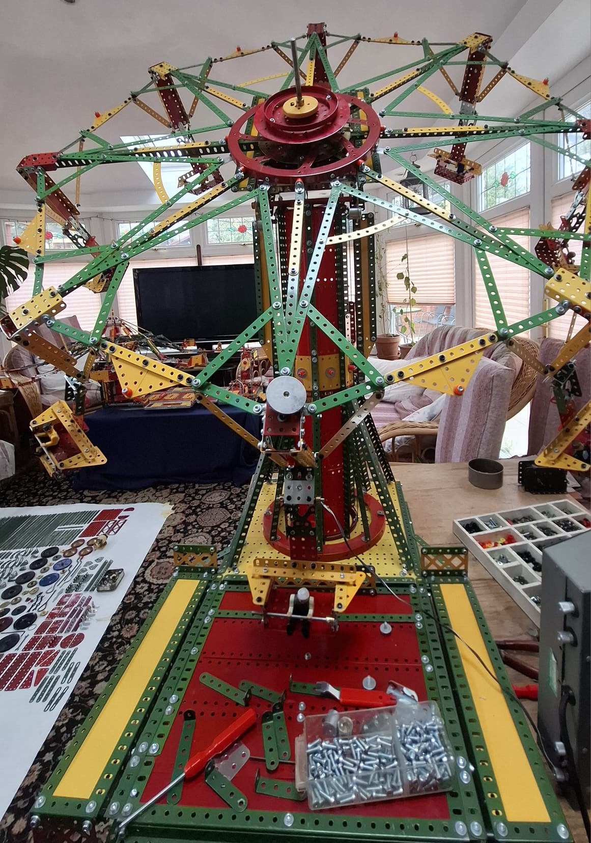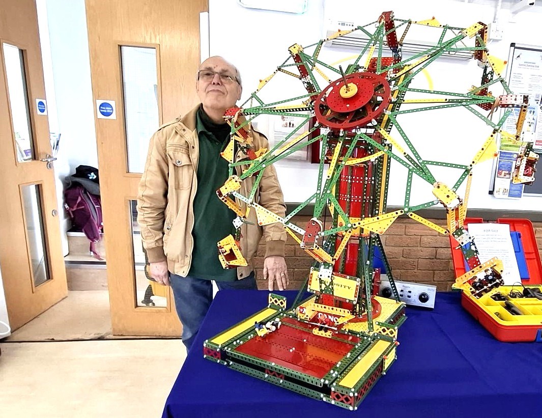 Furiosity was built before the March 2026 West London Meccano Society meeting, a fairground model with a big Ferris wheel at the top of a tower which not only rotates, but also can tilt up and down from a moving platform operated with a motor. A second motor moves the model from a tilting position to the horizontal.