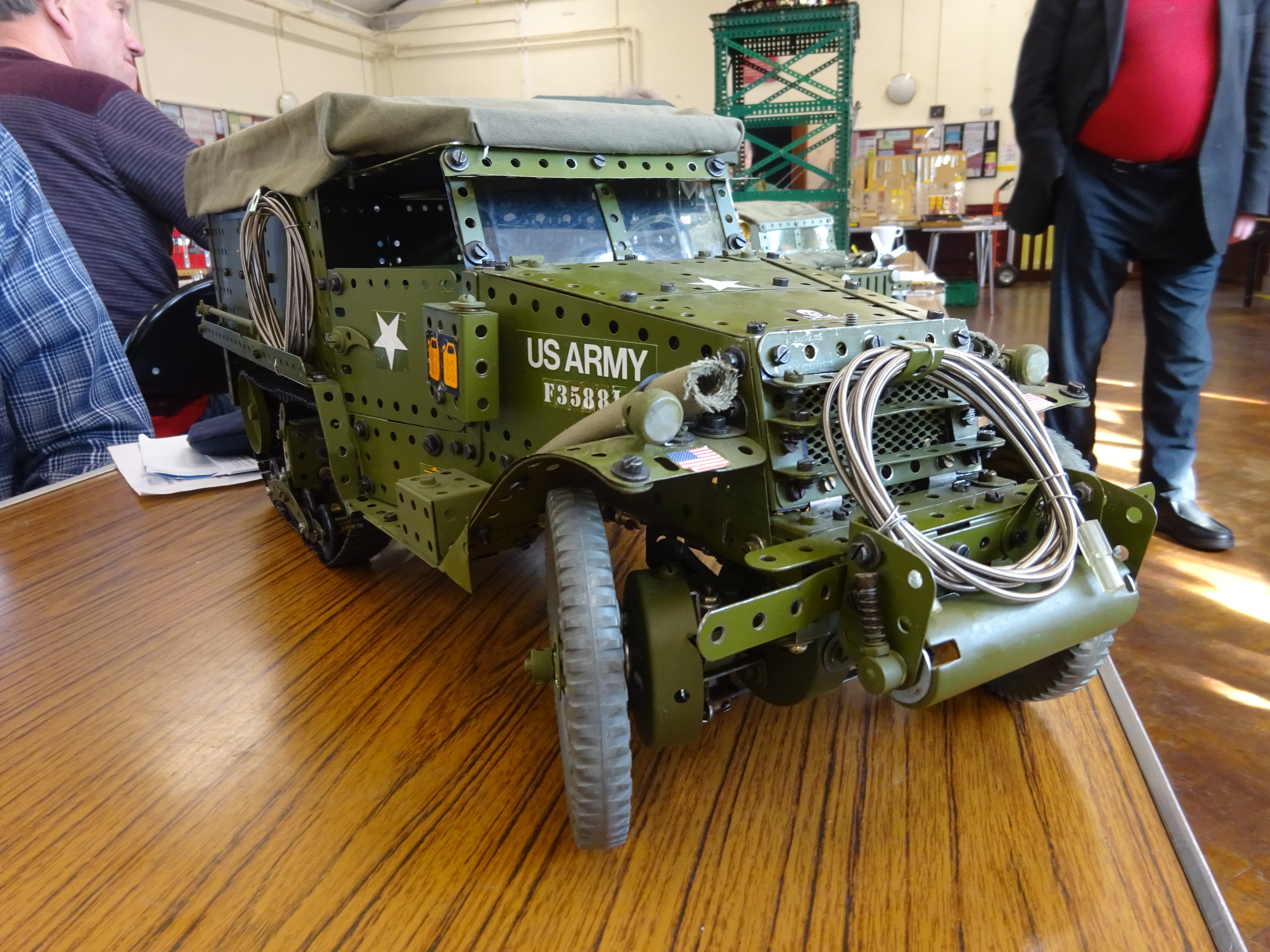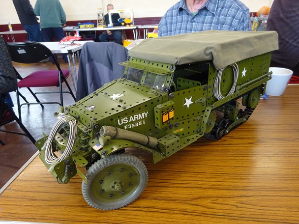 A white 1942 American half-track truck powered by a 12V geared motor with all-wheel and track drive.